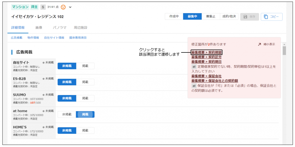 ④エラーが出ていた場合は該当の物件を検索し、エラー箇所を修正して再掲載してください。