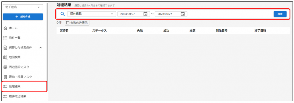 検索対象は全店舗分で、『いい生活賃貸クラウドOne』での処理結果も含まれます。