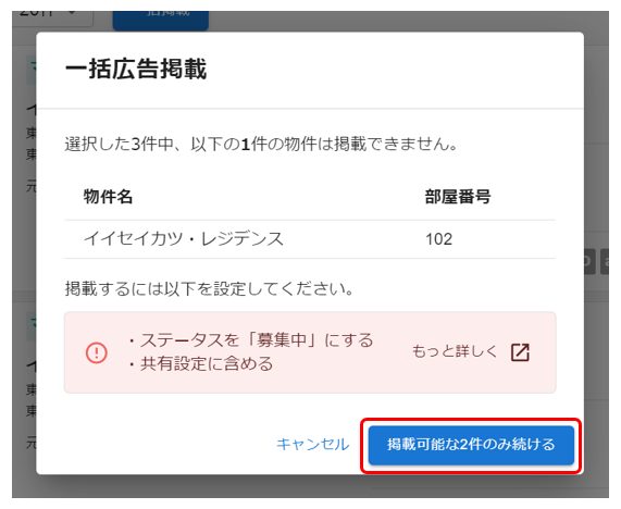 ②掲載指示を出す条件を満たしていない物件が含まれている場合、エラーが表示され、