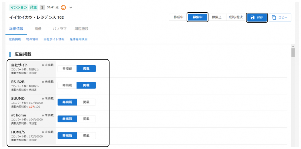 物件詳細の「広告掲載」にて掲載する媒体を選択し、保存ボタンをクリックすると掲載されます。