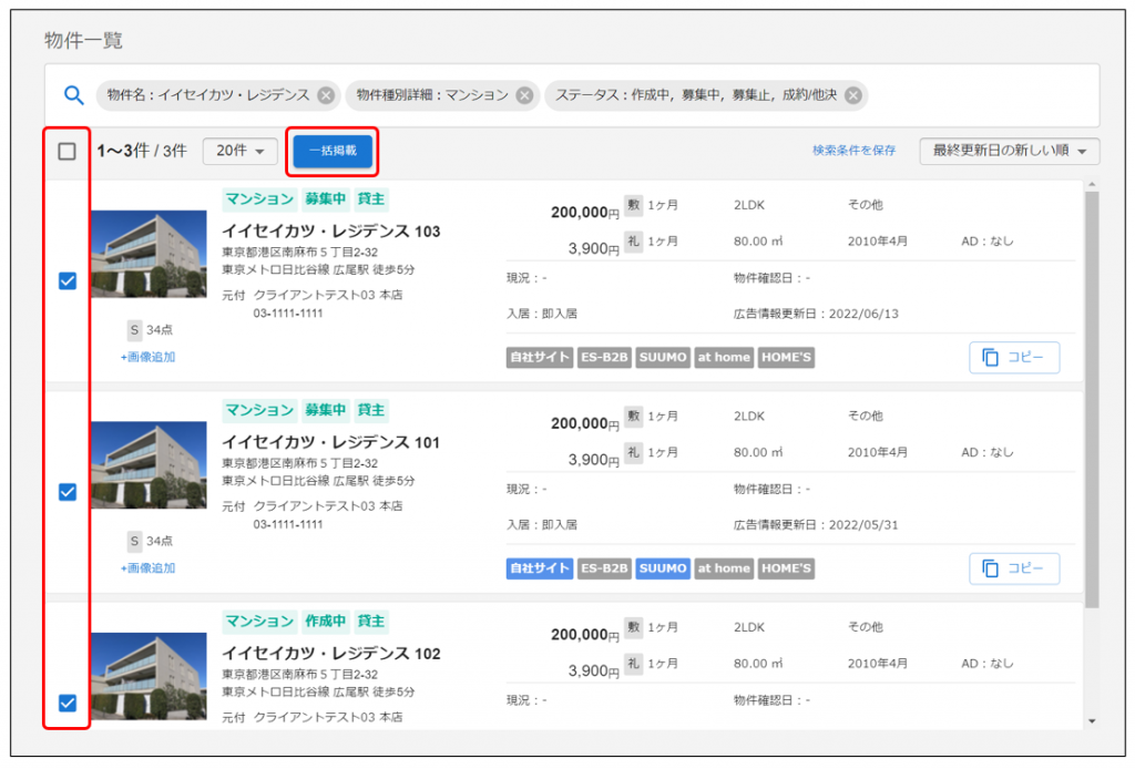 ①掲載したい物件にチェックを入れて一括掲載ボタンをクリックしてください。