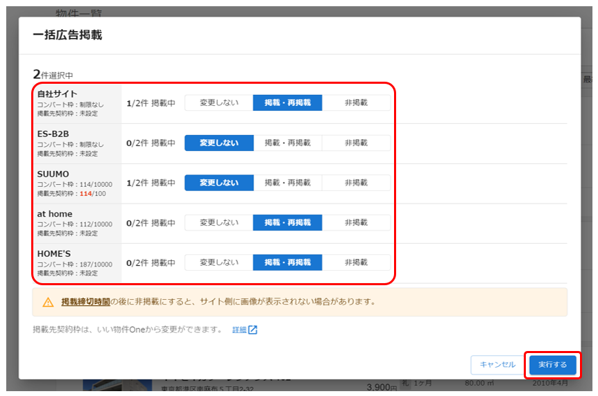 ③掲載する媒体を選択し、実行するボタンをクリックします。
