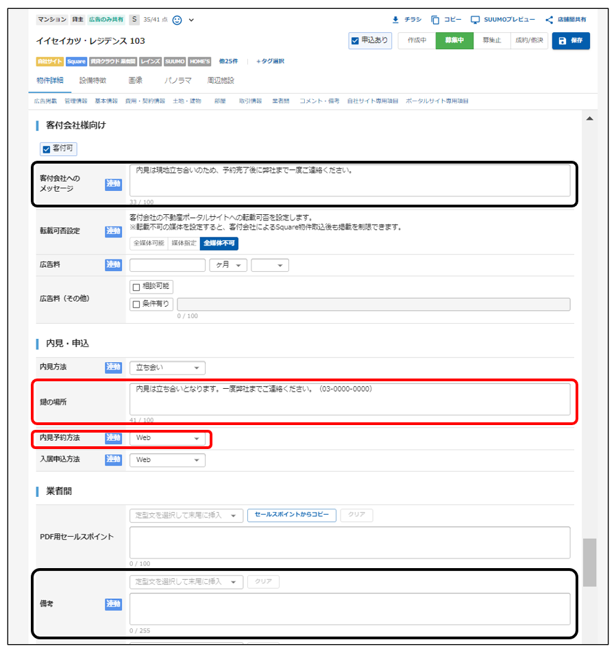 ※「備考」に入力が無い場合は「広告備考」に入力した内容が連動します。