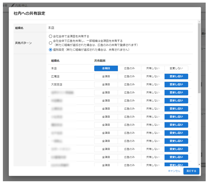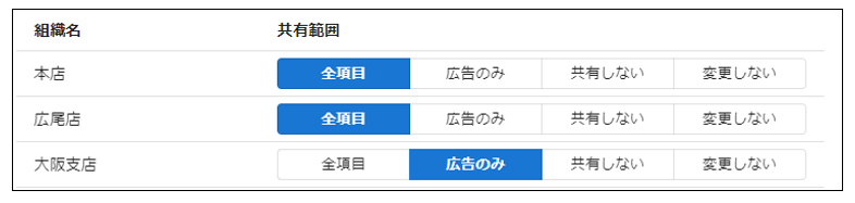 | 共有パターン | 下の共有範囲の選択状態が変わります。 ・会社全体で全項目を共有する 全店舗の共有範囲が「全項目」になります。 ・会社全体で広告を共有し、一部組織は全項目を共有する 操作中の組織以外は共有範囲が「広告のみ」になります。 ・個別設定 共有範囲を1店舗ずつ設定できます。 |