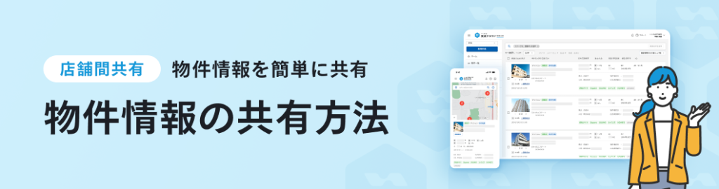 | 共有範囲 | 共有範囲には「全項目」と「広告のみ」の2種類があり、 どちらを選んだかによって共有先店舗で編集可能な項目が変わります。 ・全項目 共有先でも全ての項目を編集できるようになります。 ・広告のみ 共有先では画像や各媒体用のキャッチコピーなどの 「広告項目」のみを編集できるようになります。 賃料など契約に必要な詳細情報を編集することはできません。 ・共有しない 該当物件の閲覧や操作ができなくなります。 共有を外したい時に選択してください。 ・変更しない 現在の共有設定から変更されません。 |