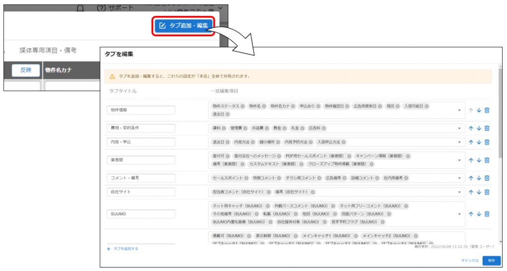 右上の「タブ追加・編集」から一括編集画面に表示する項目をカスタマイズすることができます。