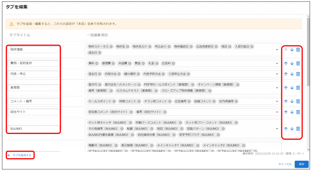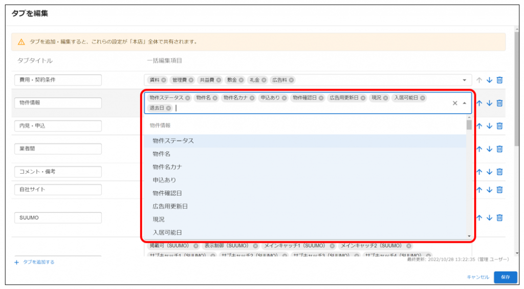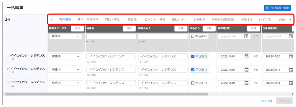 予めよく編集する項目をタブにまとめておくことで、効率的に一括編集を行っていただけるようになります。