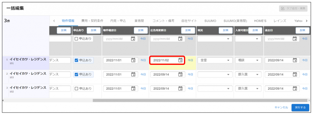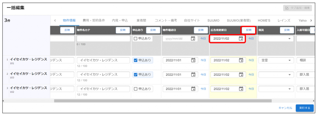 一番上の行を編集し「反映」をクリックすると編集中の全物件に一括で同じ内容が反映します。