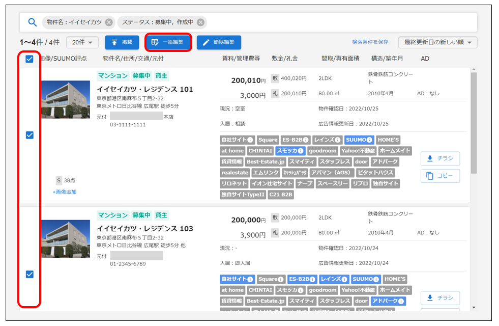 1.物件一覧で編集したい物件にチェックを入れ、「一括編集」をクリックします。