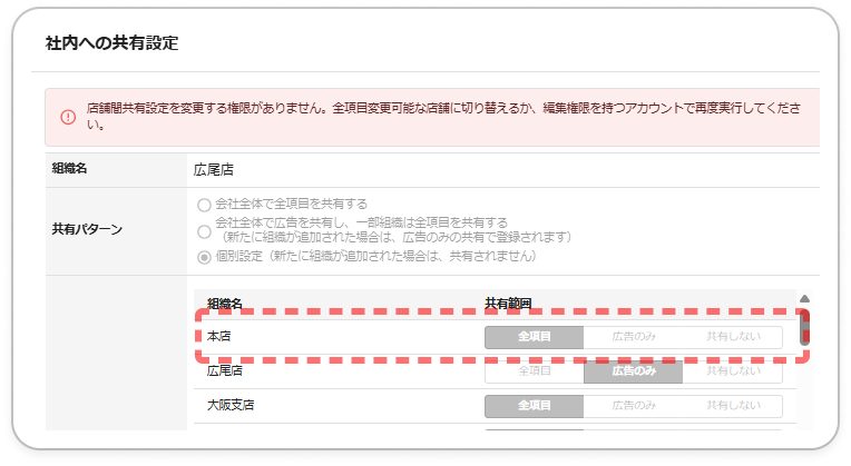 「店舗間共有」設定が「全項目」になっている必要があります。