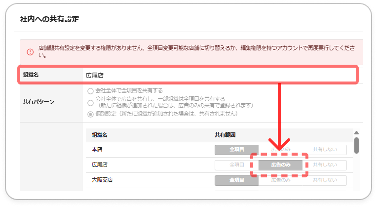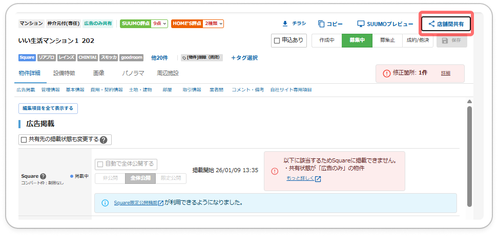 共有範囲が自店舗に対して「広告のみ」となっている物件に関しては、掲載することができません。