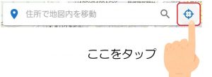 表示済みの地図検索画面で現在地を確認したい場合は、住所検索欄の右側にある、現在地取得ボタンをタップしてください。現在地が表示されます。