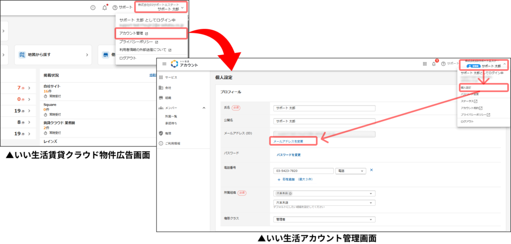 いい生活 賃貸クラウド物件広告 右上 アカウント名>アカウント管理>いい生活アカウントの管理画面より