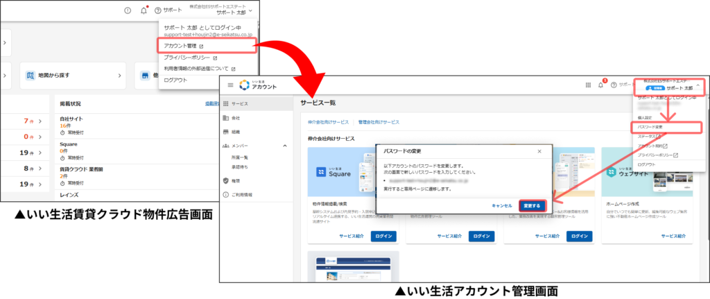 いい生活 クラウド物件広告 右上のアカウント名>アカウント管理>いい生活アカウントの管理画面より、パスワードの再設定が可能です。