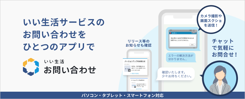 「いい生活お問合せアプリ」は、チャット形式にていい生活サポートセンターにお問合せいただけるサービスです。パソコン・スマートフォン・タブレット等からお手軽にご利用いただけます。お電話では伝えにくい内容も、画像や添付ファイルを用いてご質問いただけますのでぜひご登録ください。いい生活問い合わせアプリご利用手順