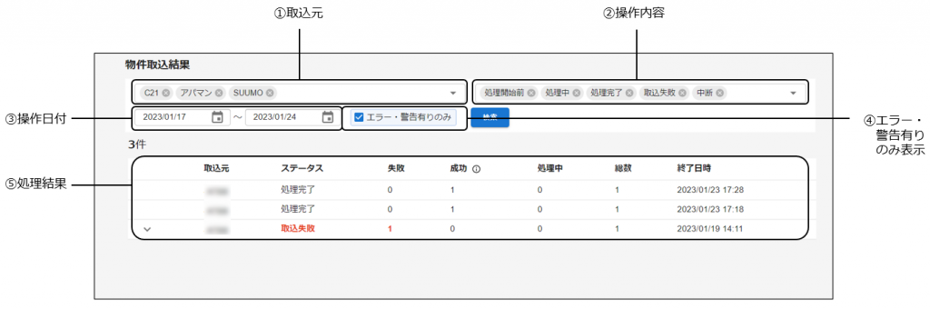 | ⑤処理結果 | 指定した操作内容の処理結果を表示します。 取込失敗の行をクリックすると物件名などを確認できるます。 ※画面左上で選択している組織以外の処理結果も表示されます。 |