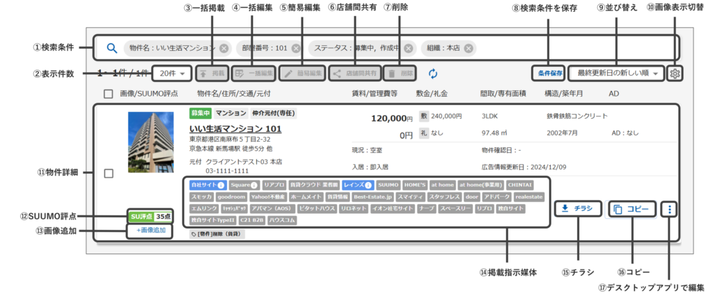 | ⑰デスクトップアプリで編集 | 「いい生活デスクトップアプリ」で物件詳細を開くことができます。 |