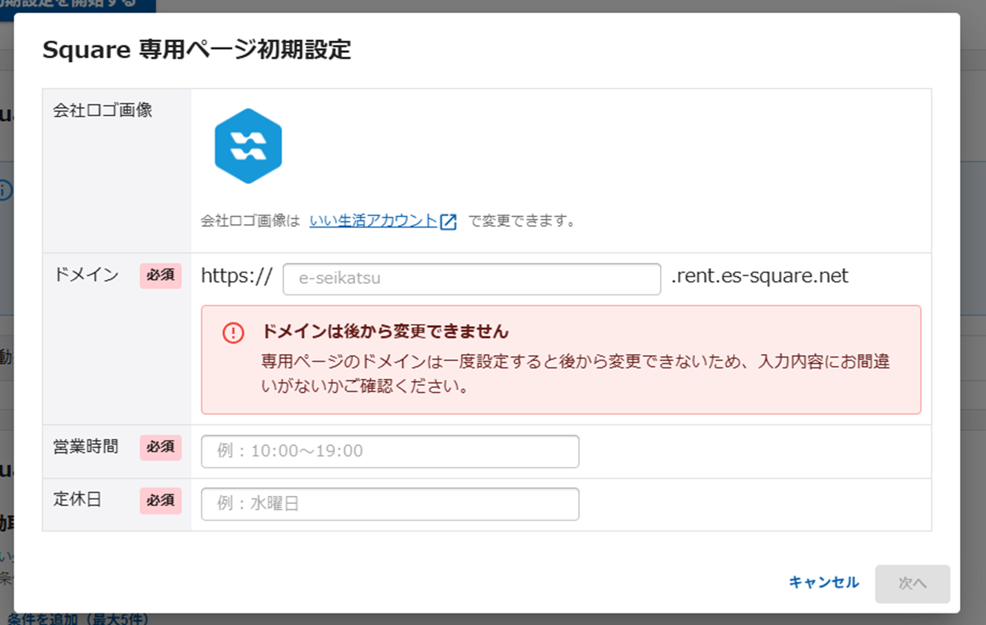 本画面では、会社ロゴ画像の確認と、ドメイン、営業時間・定休日の設定を行います。