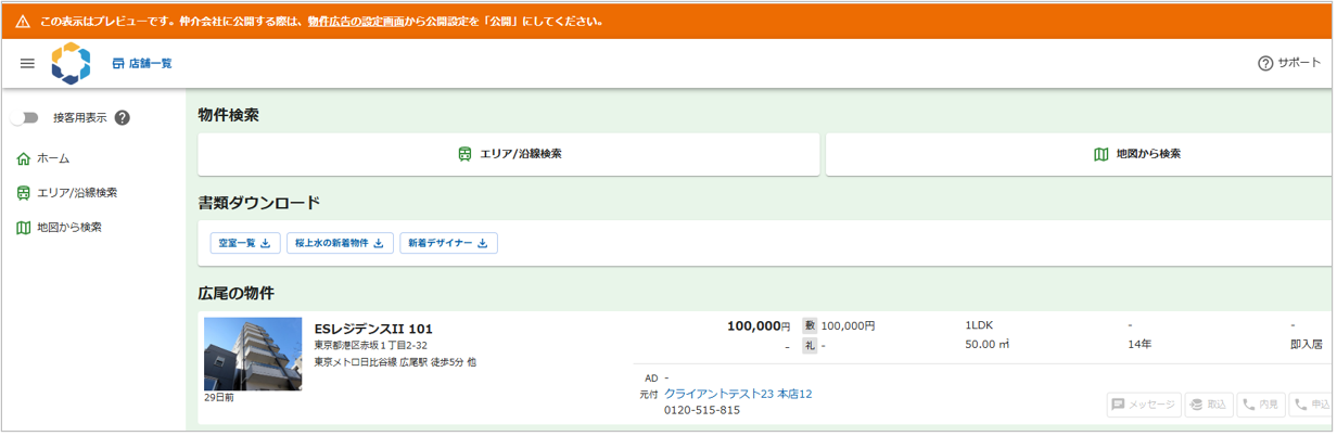 仲介会社に公開する際は、物件広告の設定画面から公開設定を「公開」にしてください。