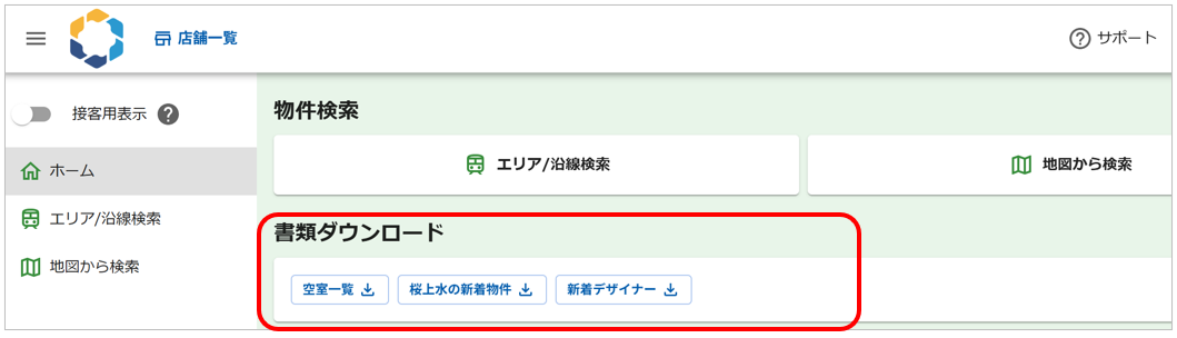 表示した空室一覧とアップロードした書類は、専用ページのホーム画面からダウンロードすることができるようになります。