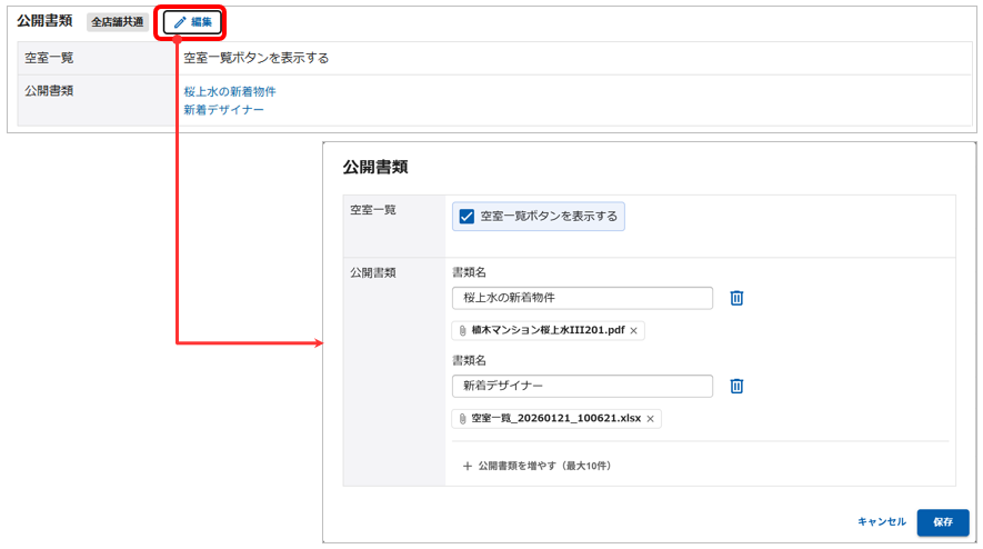 公開書類では、専用ぺージに空室一覧ボタンを表示するかどうかの設定と、その他書類をアップロードすることができます。