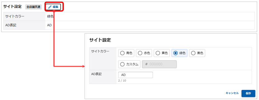 サイト設定では、サイトカラーの指定と、AD表記の設定を行えます。