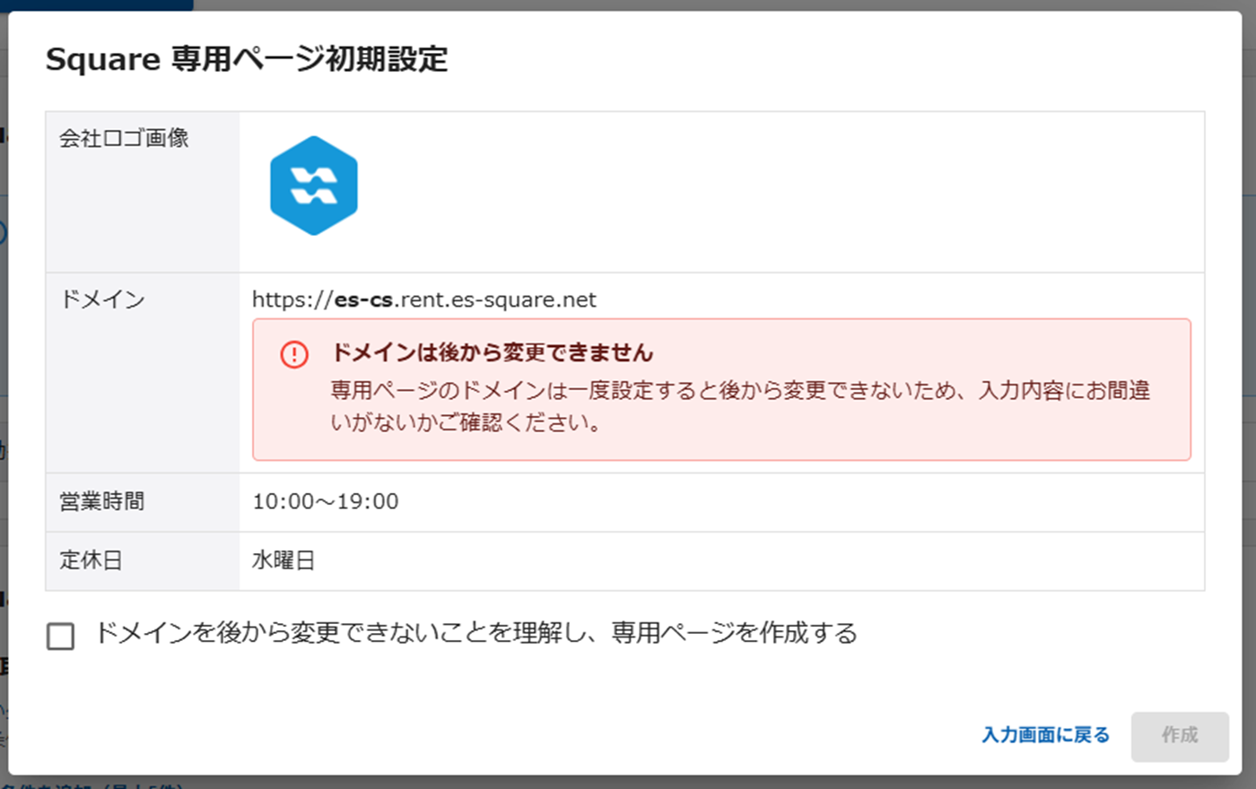 「ドメインを後から変更できないことを理解し、専用ページを作成する」にチェックをつけて「作成」を行ってください。