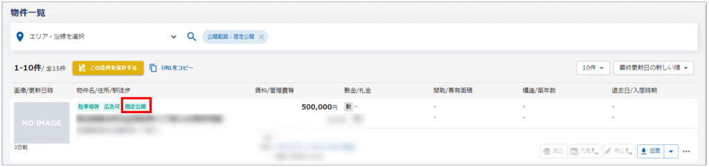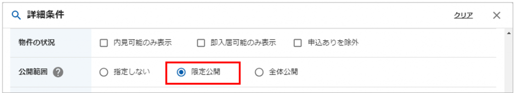 また、仲介会社様はいい生活Squareの検索条件にて、「限定公開」されている物件のみを検索することが可能です。