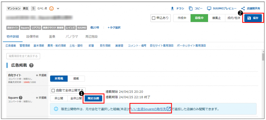 「限定公開」することで、いい生活Squareにて「取引先」となっている不動産会社様へのみ物件を公開できます。