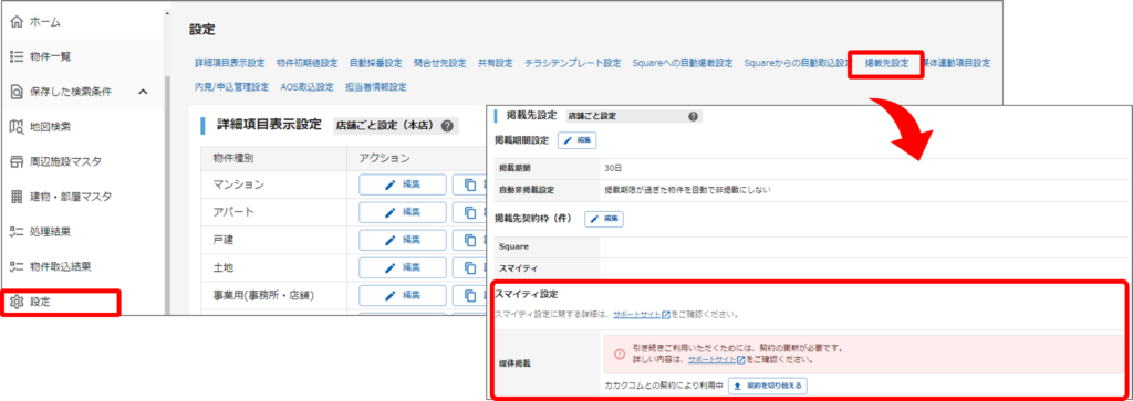 1.設定>掲載先設定>スマイティ設定を開きます。