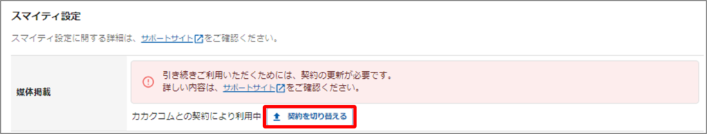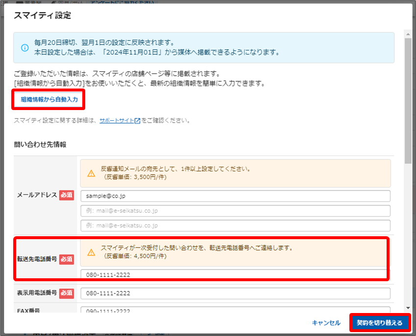 4.反響通知先メールアドレスなど、スマイティ掲載に必要な情報をご登録いただき、「契約を切り替える」をクリックします。