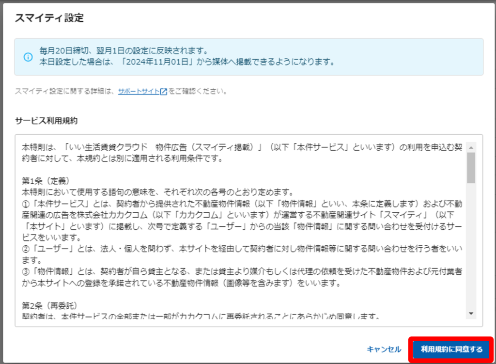 2024年10月3日から、いい生活賃貸クラウド 物件広告上にスマイティ設定が表示され、切替設定が可能となります。