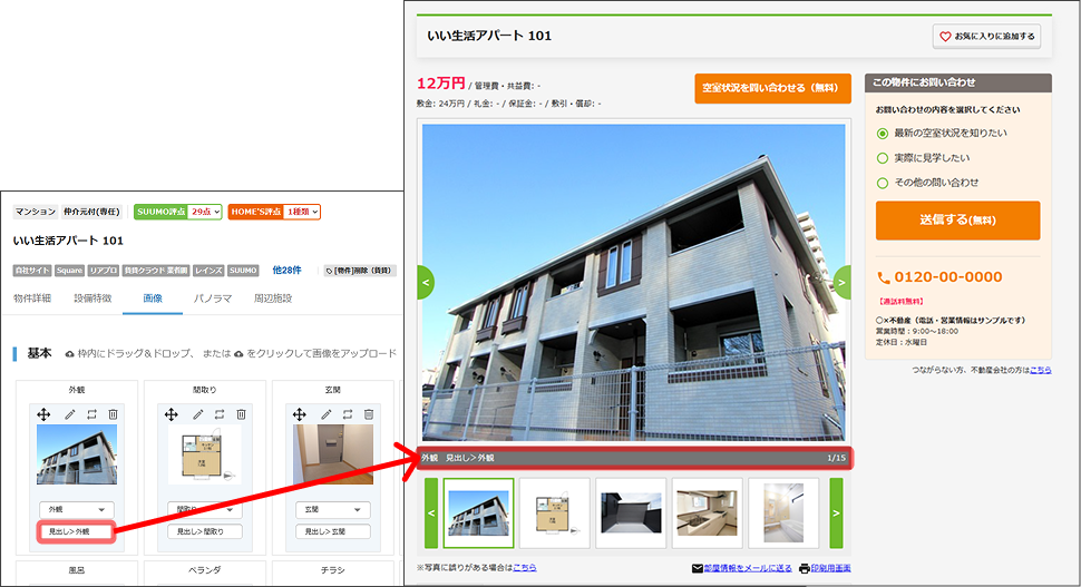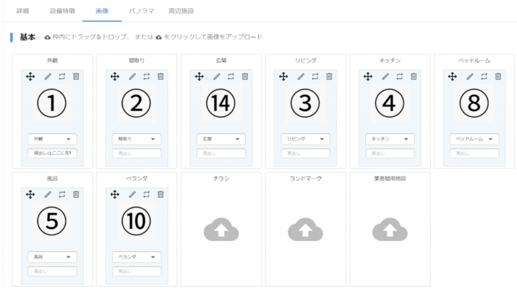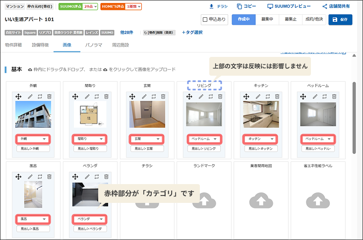 SUUMOに反映する画像の順番は、以下の「カテゴリ」の順番通り通りとなっております。