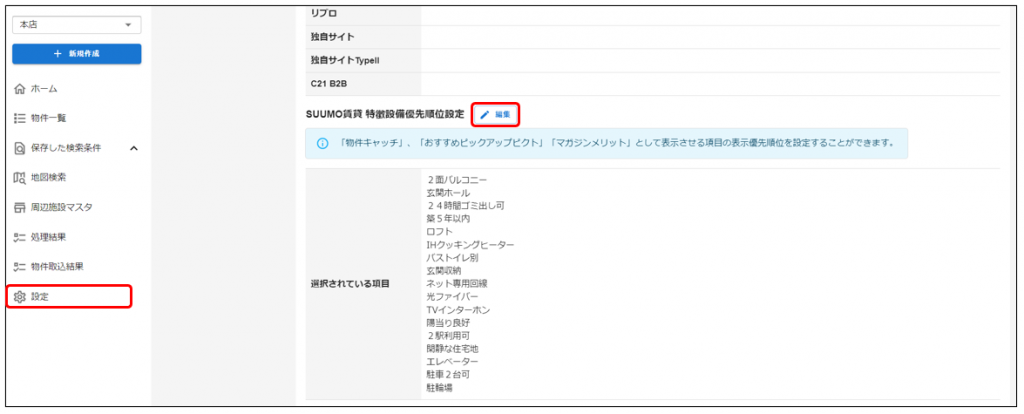 1.設定の「SUUMO賃貸 特徴設備優先順位設定」の編集ボタンを押します。