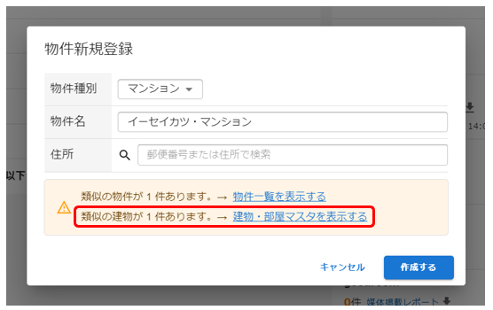 物件新規登録時に、類似の建物があれば、「建物・部屋マスタを表示する」のリンクから