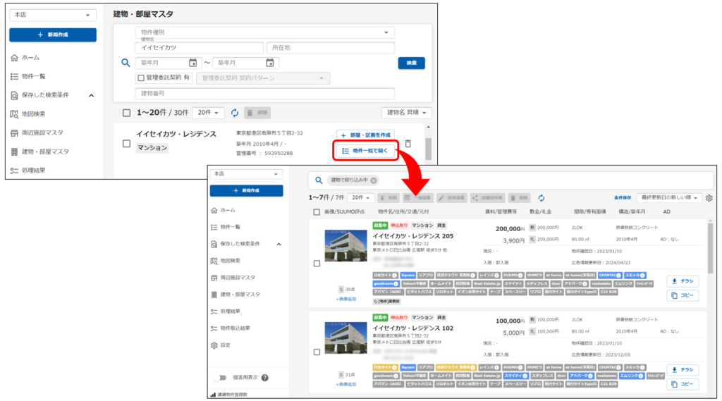 「物件一覧で開く」ボタンより、対象の建物に紐付く募集情報の一覧を開けます。