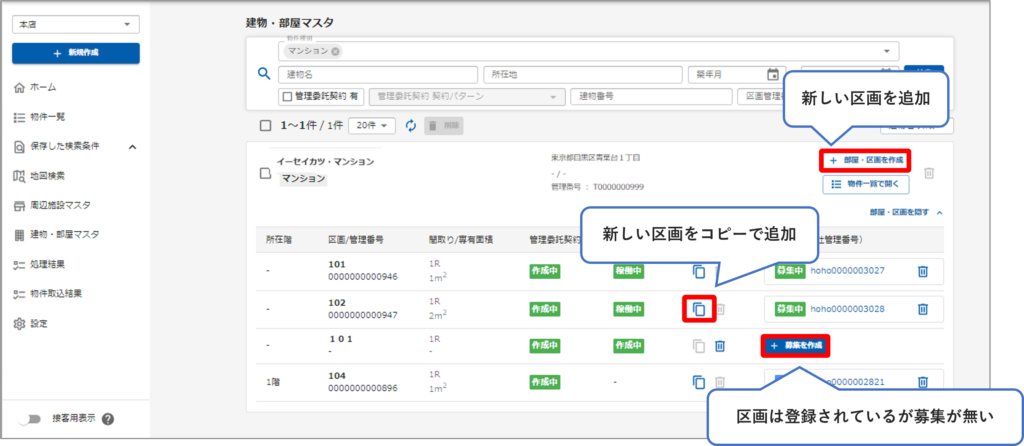 該当の建物が登録済みの場合は、以下いずれかの方法で募集情報を作成できます。