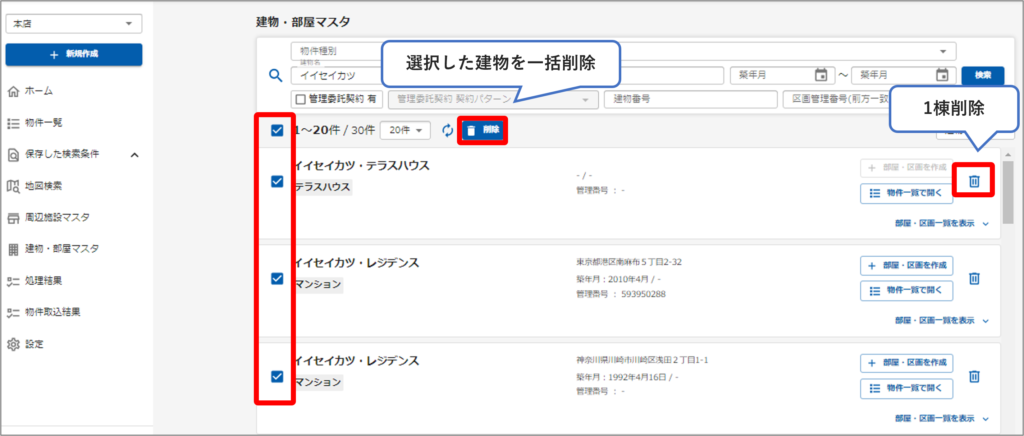 削除したい建物にチェックを入れ、「削除」ボタンより一括削除に進めます。